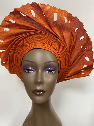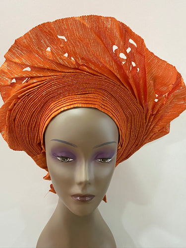 Orange Laser Cut Aso-Oke Auto Gele